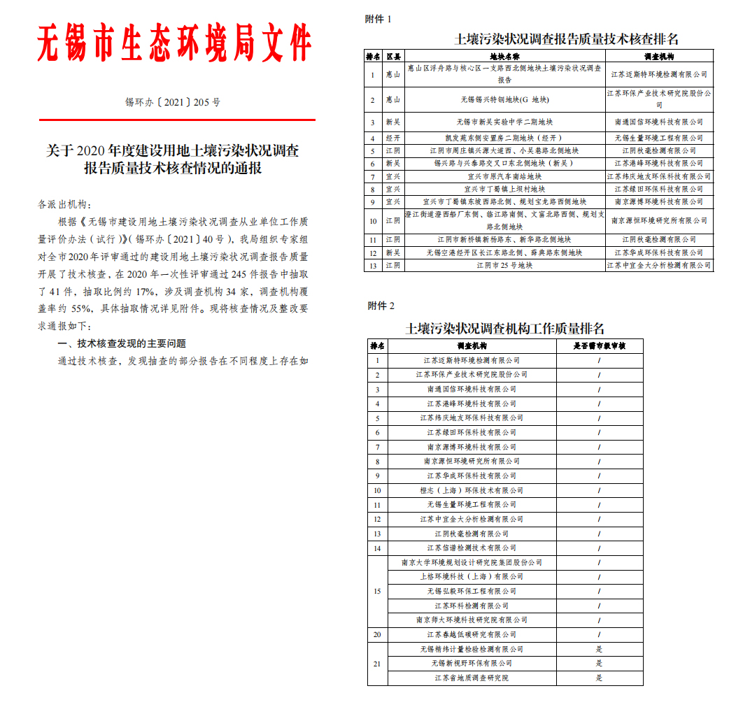 江苏迈斯特2020年度出具的《惠山区浮舟路与核心区一支路西北侧地块土壤污染状况调查报告》在本次评比中获得土壤污染状况调查报告质量技术核查和调查机构工作质量排名双第一的优异成绩!